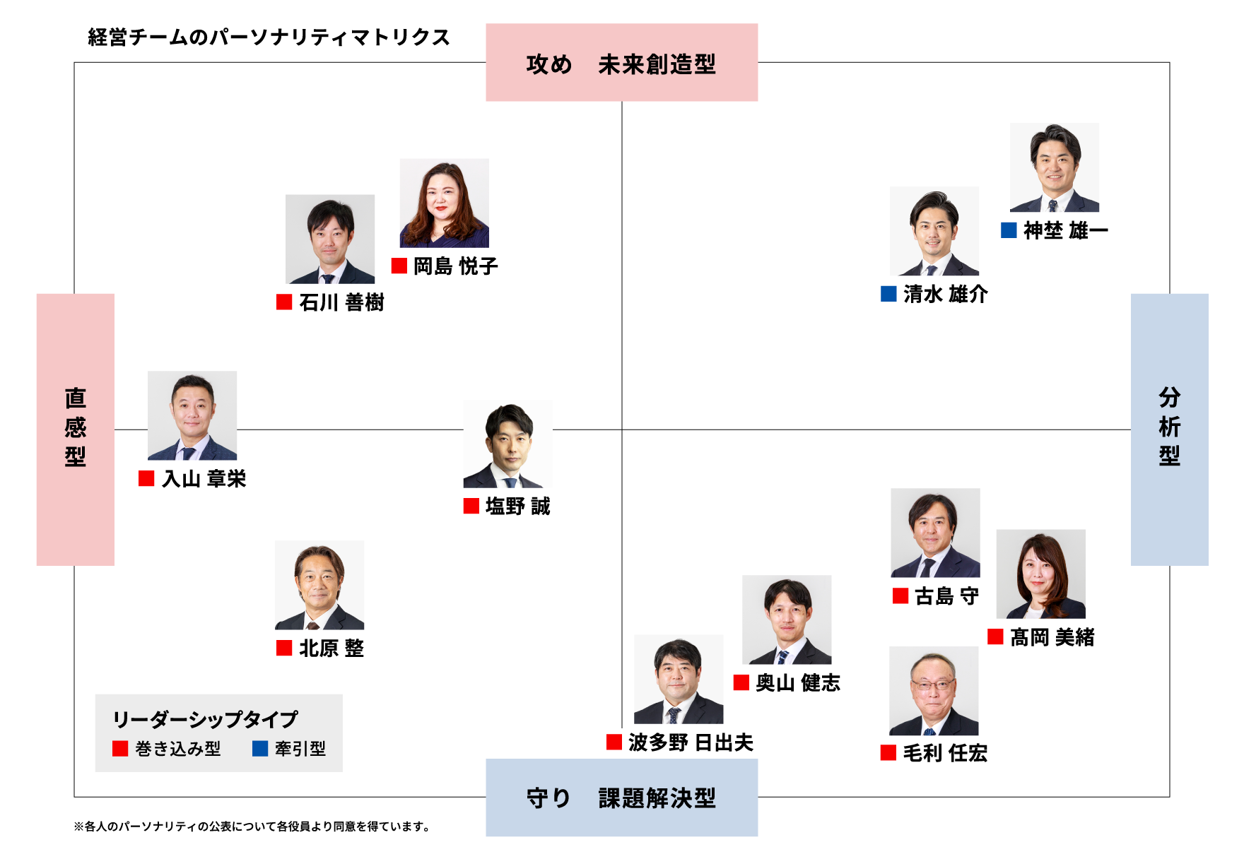 以下、当社取締役陣のパーソナリティマトリクスおよび各人のパーソナリティの分析結果をご紹介します。
