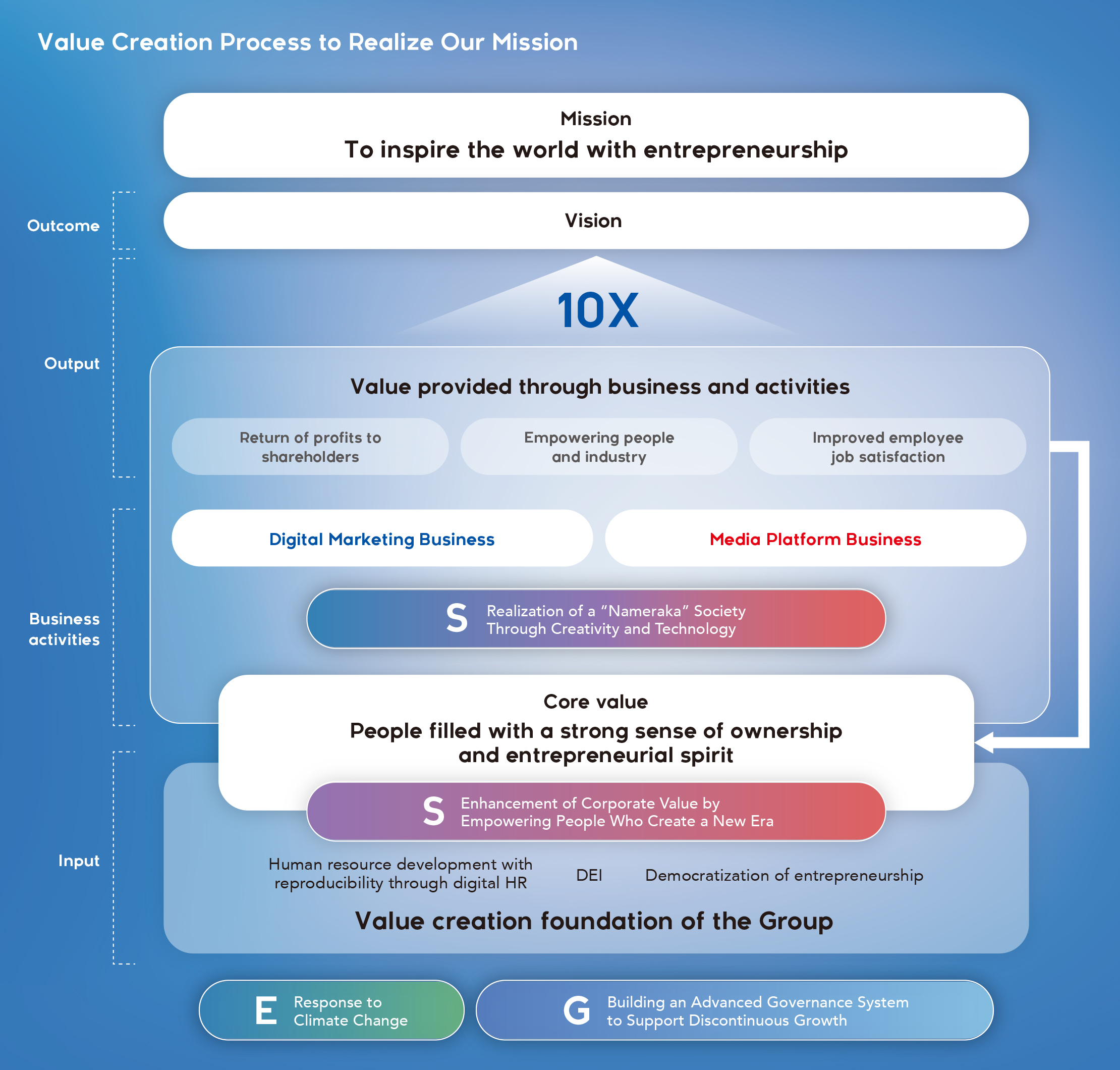 Our value creation foundation, including our efforts to develop human resources through digital HR, will promote the active participation and growth of our people. At the same time, we will firmly establish entrepreneurship as an organizational culture. Through this approach, entrepreneurship is also demonstrated in our businesses and activities, which leads to an increase in the value we provide to our stakeholders.